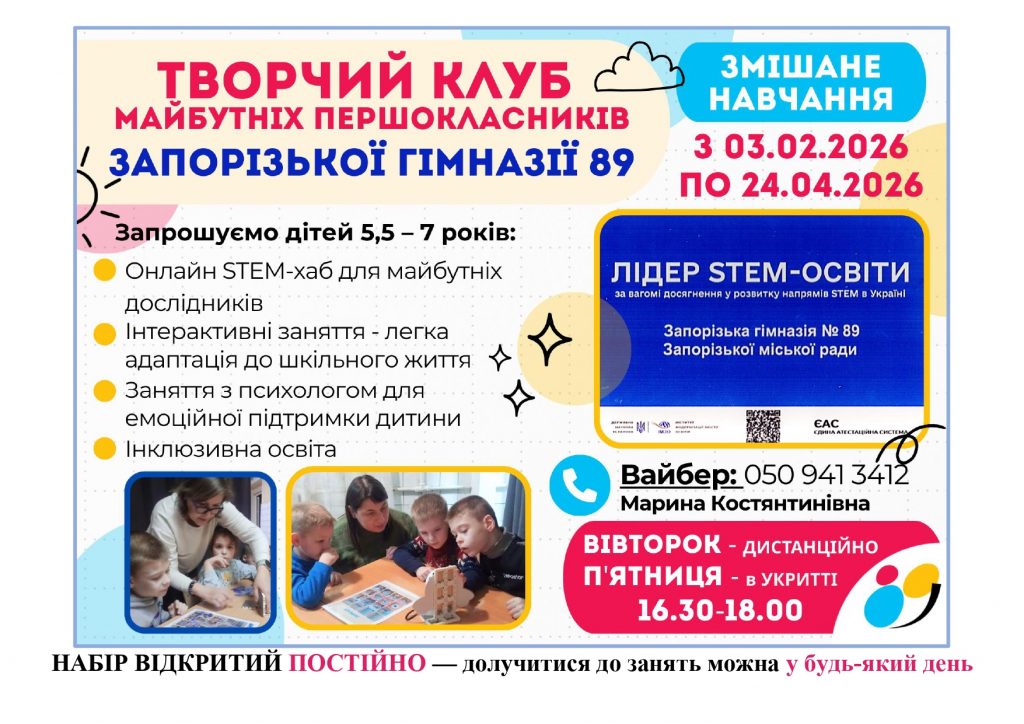 Запрошуємо ваших дітей до ТВОРЧОГО КЛУБУ майбутніх першокласників Запорізькій гімназії №89.